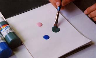 2.筆の片側半分に絵の具をつけ、反対がわに違う絵の具をつけます。